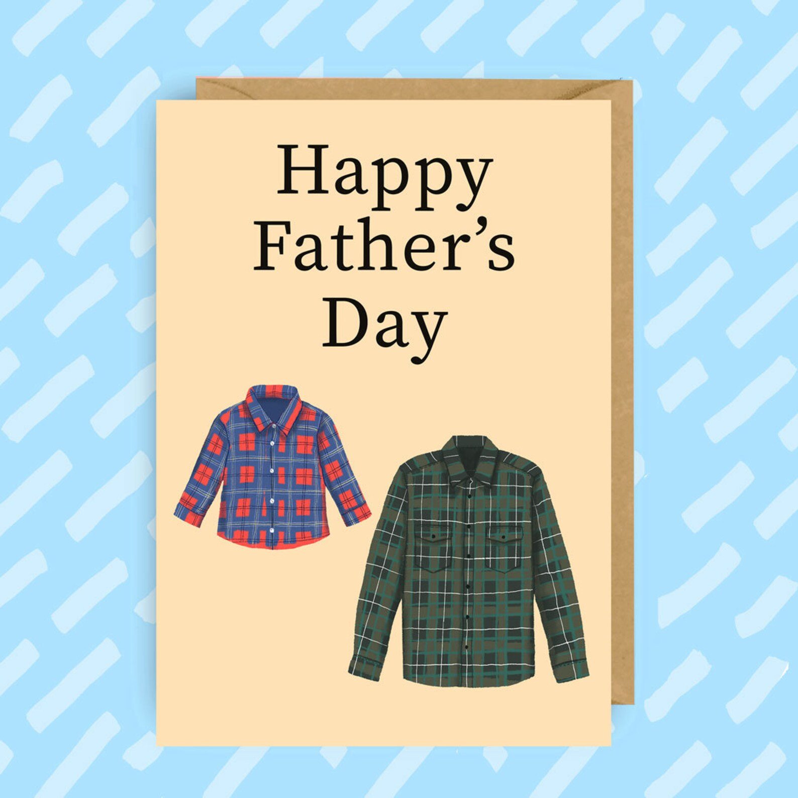 👕 A lumberjack t-shirt design — one small, one big — no people, just possibility. This card is a tribute to any father figure, biological or not. And also a good fit for single dads.