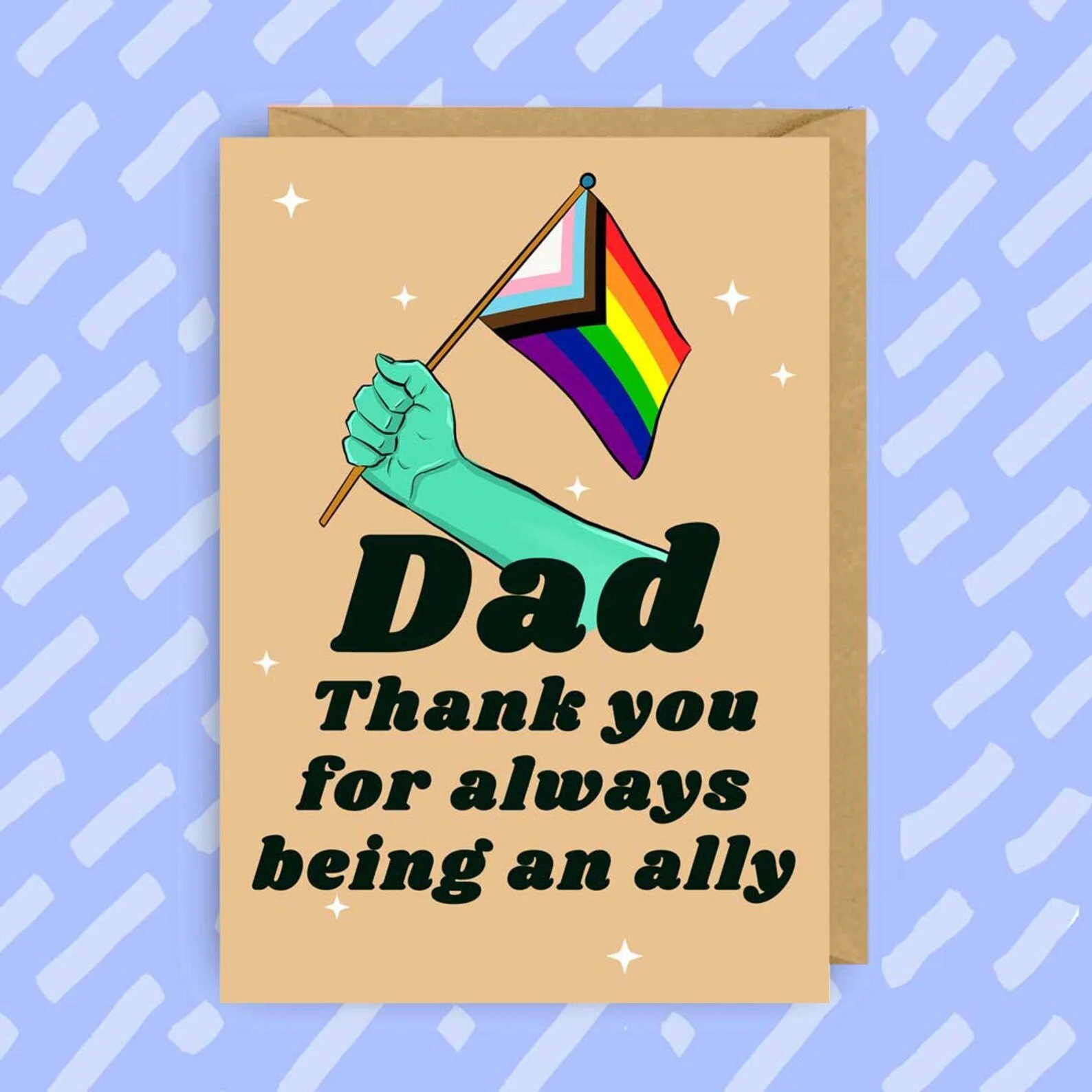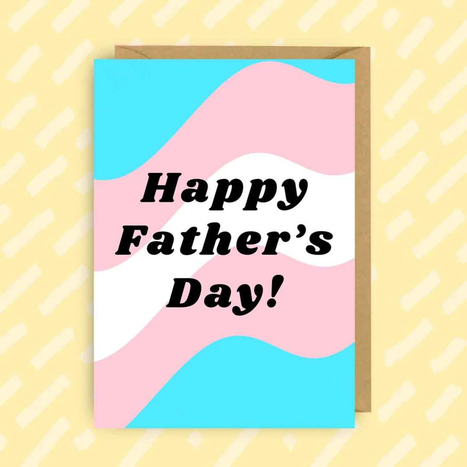 A soft and powerful design featuring the words “Happy Father’s Day” with the trans flag colours in the background. Because trans dads should be seen and celebrated.