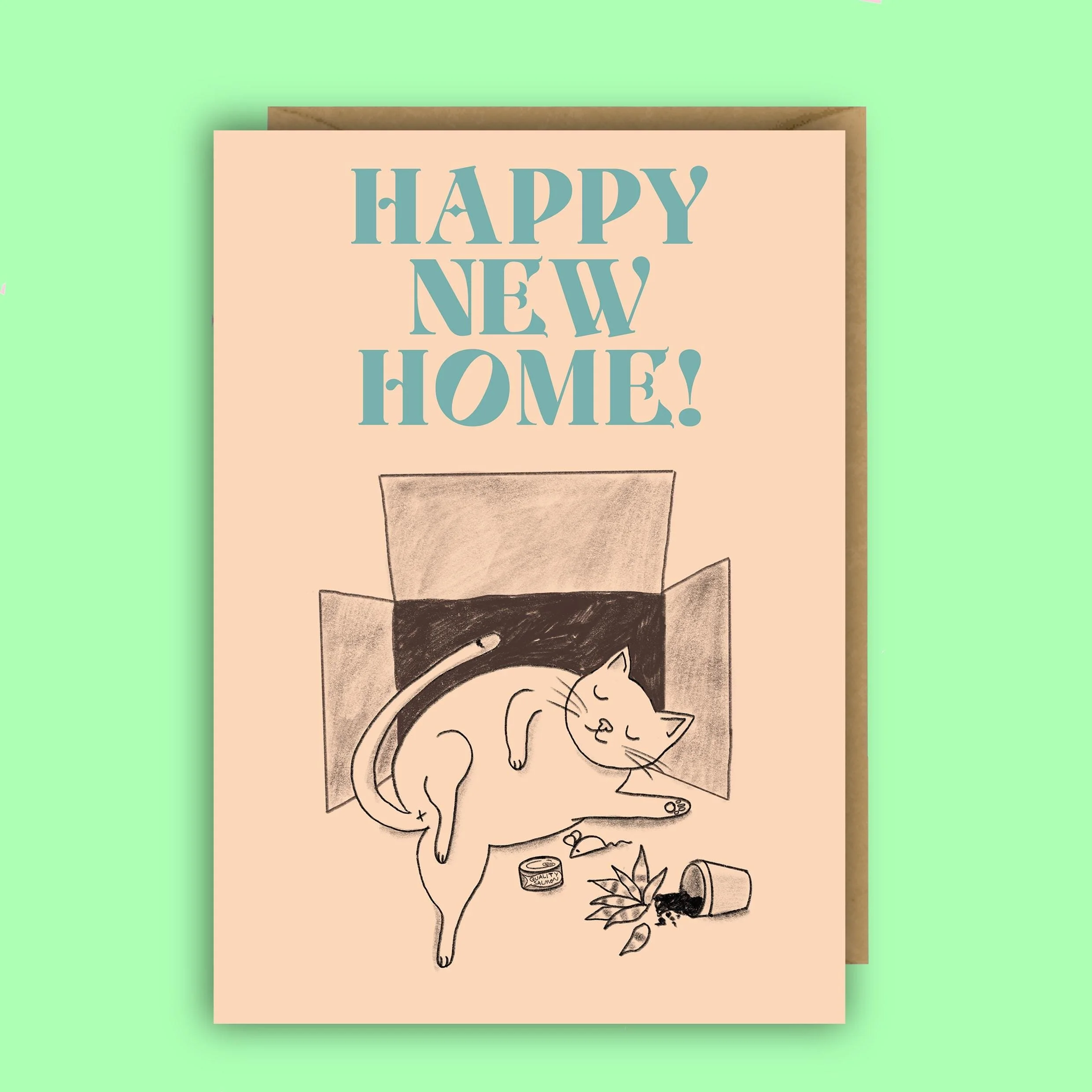 Wish a Happy New Home or Moving House greeting card by our sassy cat, created with love at home and professionally printed.