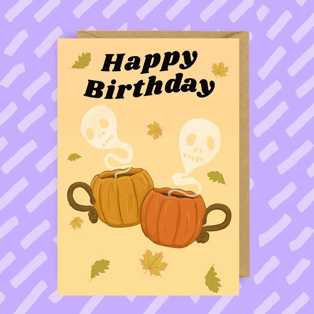 Halloween Birthday Card: Pumpkin Coffee, Spooky Ghosts (A5)